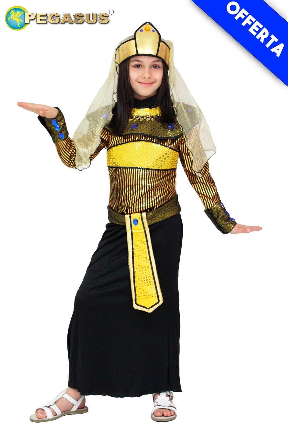 Il costume regina del nilo è disponibile in 5 taglie a partire da S 5/6 ANNI fino a XXL 12/13 ANNI.Nel pratico scatolo 8x26x32 del costume da Regina del nilo troverai i seguenti elementi: copricapo, maglietta, collare, polsini, cintura e gonna. Il costume è realizzato in maglina, maglina laminata stampata, paillettes, crespo lamè, sbiego, strass e tulle lamè.Designer Italiano:la maglietta è realizzato in maglina lamina con stampa e maglina con applicazione ricamata cintura sulla maglia, con chiusura zip sul dietro,la gonna è realizzato in tessuto maglina . Il costume si completa con una sfiziosa cintura sulla vita oro egiziana in tessuto paillettes e crespo lamè, con copricollo in paillettes con applicazione termoadesivo e strass.Costume perfetto per feste di Compleanno, Travestimenti, feste a tema, Cosplay,giochi di finzione, giochi di ruolo, Carnevale e sfilate di Carnevale.Avvertenze indossare sotto visione di un adulto.Istruzione lavaggio: lavare a mano a bassa temperatura,lavare le parti separatamente, non strizzare, stirare a 110 gradi massimo a rovescio. CLEOPATRA, EGIZIANO, EGIZIANA, egizianieantichifamily, OFFERTABAMBINO, OFFERTACOSTUMICARNEVALE, OFFERTA